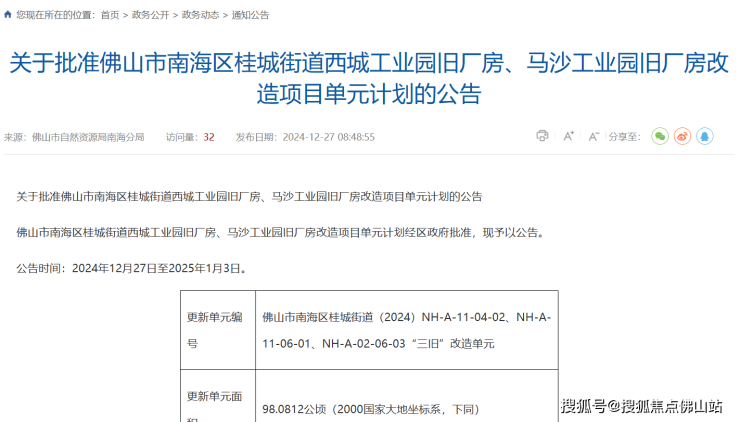 公告显示,佛山市南海区桂城街道西城工业园旧厂房、马沙工业园旧厂房改造项目单元计划经区政府批准。