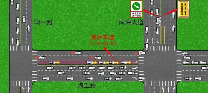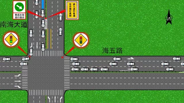 另外,本月19日起,南海大道-海五路北进口将试运行“借道左转”措施,向对向车道“借”一条车道作为左转车道,以提高左转车的通行能力。