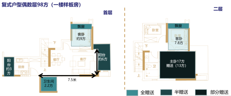 值得一提的是,98方的复式户型赠送面积达22.4㎡,其中阳台4.5㎡,主人房赠送13㎡,厕所(首层阳台改)赠送2.2㎡,飘窗赠送2.7㎡。