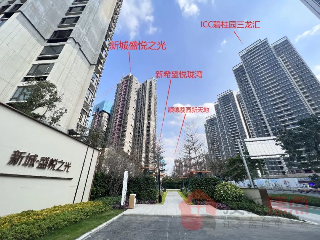 就比如这一条路上,3个路口的三个盘:新城盛悦之光、新希望悦珑湾和顺德荔园新天地,平均两两之间相距间隔不到200米。