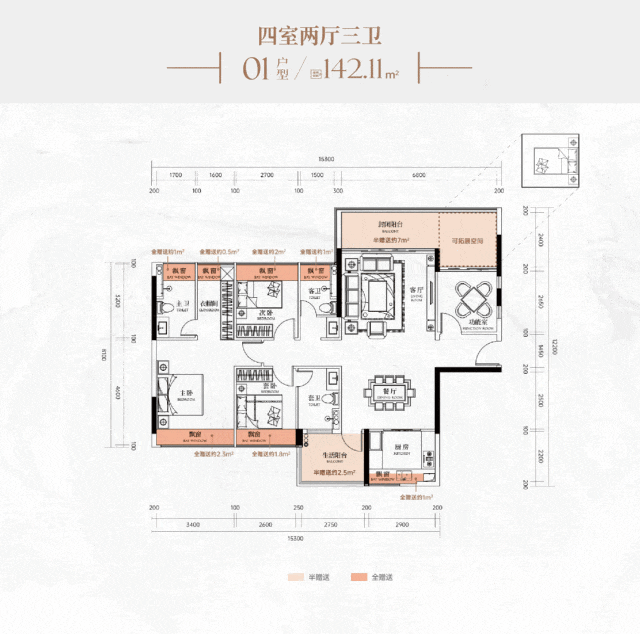 具体来看看户型,建面约142㎡四房两厅两卫,LDKB一体化,四开间朝南,双主套设计,全屋赠送面积超22㎡。