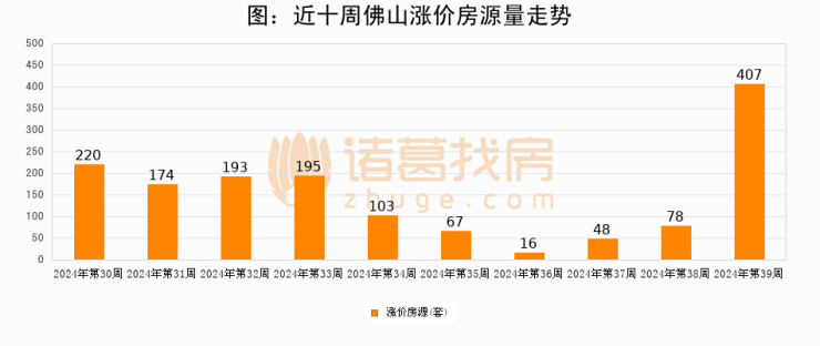 从调价房源来看,第39周佛山涨价房源407套,较上周上涨421.8%。与此同时,39周涨价房源占比提升0.91个百分点,业主信心持续恢复。