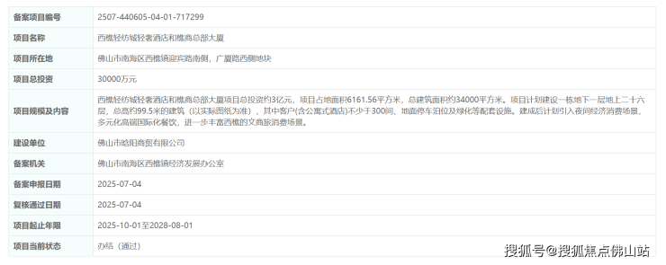 近日,广东省投资项目在线审批监管平台显示,西樵轻纺城轻奢酒店和樵商总部大厦项目已通过备案。