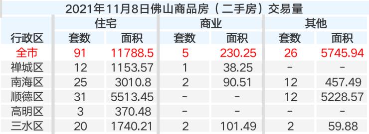 二手住宅成交91套,成交面积11788.51㎡,其中禅城12套,南海25套,顺德区31套,高明区3套,三水区20套。