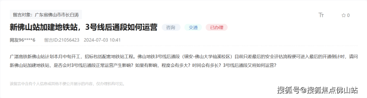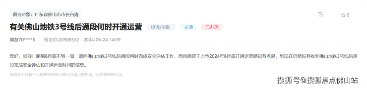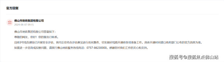 8月7日,佛山市地铁集团有限公司在其中一条留言下作出了最新回复:目前3号线在建段已开展安全评估,我司正在结合评估意见进行优化整改,切实做好线路开通前各项准备工作。具体开通时间请以政府部门公布的官方消息为准。