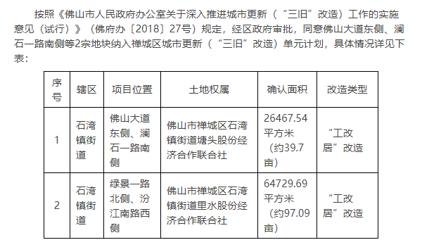 另外,今年3月禅城区政府审批,同意将禅城区佛山大道东侧、澜石一路南侧地块,绿景一路北侧、汾江南路西侧地块2宗地块纳入禅城区城市更新(“三旧”改造)单元计划。