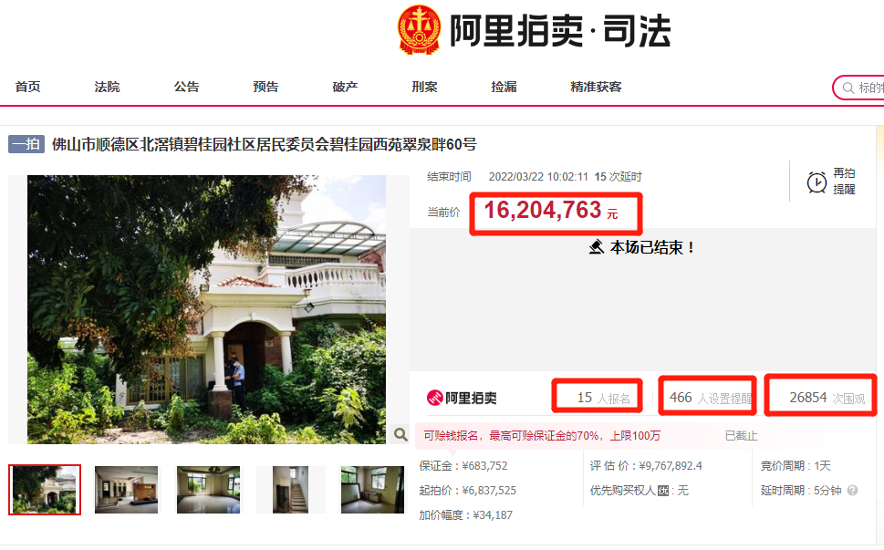 位于顺德北滘碧桂园的一套别墅,起拍价约683万,吸引了15人报名,466人设置提醒,26854人围观!
