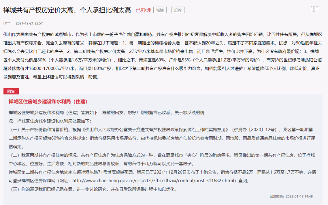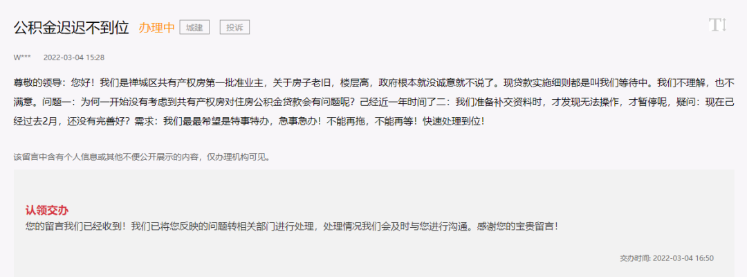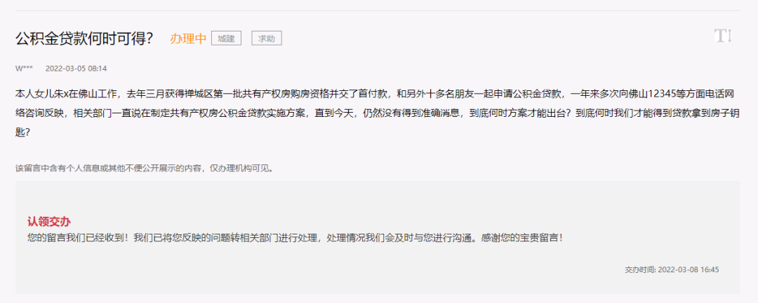 翻开领导留言板上,就有网友留言表示:“去年三月获得禅城区排名前列批共有产权房购房资格并交了首付款,随后提交资料并申请公积金贷款,然而到目前为止,这个共有产权房公积金贷款实施方案,仍然没有得到准确消息。”