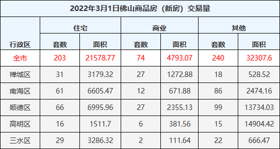 3月1日,佛山一手住宅成交203套,成交面积21578.77㎡