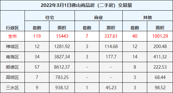 二手住宅成交119套,成交面积15443㎡,禅城12套,南海区34套,顺德区57套,高明区7套,三水区9套。