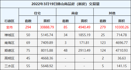 3月19日佛山五区一手房网签294套,二手房网签102套