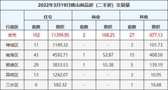 二手住宅成交102套,成交面积11399.95㎡,禅城11套,南海区43套,顺德区29套,高明区13套,三水区6套。