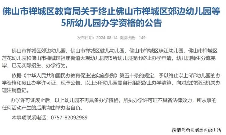 8月14日,佛山市禅城区教育发布关于终止佛山市禅城区郊边幼儿园等5所幼儿园办学资格的公告。