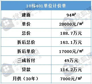 以10栋401房为例,建面94㎡,总价约188.7万元,单价约20000元/㎡,折后总价约163.1万元,折后单价为17000元/㎡。