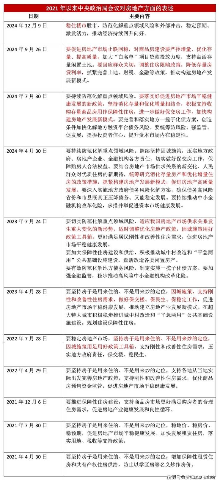 业内认为,此前9月26日的政治局会议定调“要促进房地产市场止跌回稳”,释放了最强“稳地产”信号,本次会议再次提出要“稳住楼市”,释放了更加坚定的稳楼市信号,2025年稳定房地产市场对于稳定宏观经济至关重要。