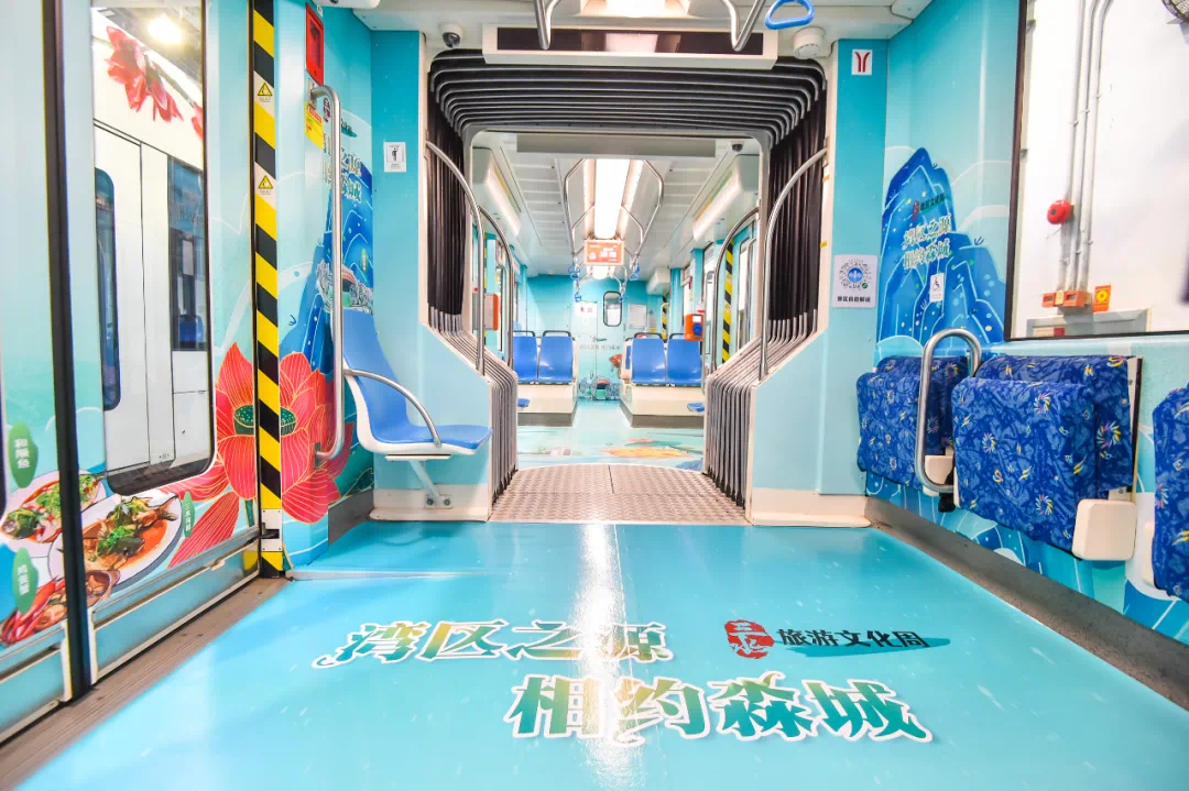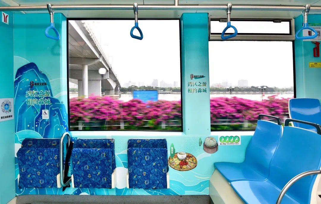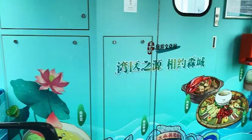 “三水号”专列的设计以“湾区之源 相约淼城”为主题,展示了众多三水特色元素,包括荷花世界、文创古镇、大旗头古村、南丹山等文旅景点,以及三水河鲜、长寿醋、簸箕宴、乐平大包、冬瓜盅、荷花宴、腊鸭扎、鸡煲蟹等三水美食。
