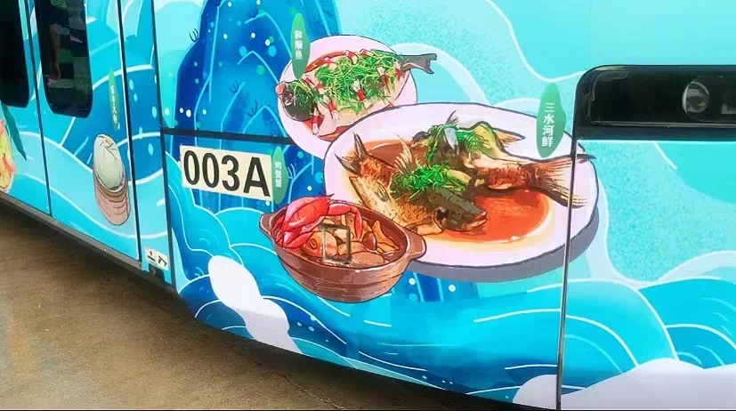 “三水号”专列车身外绘着让人食欲大振的三水河鲜美食。