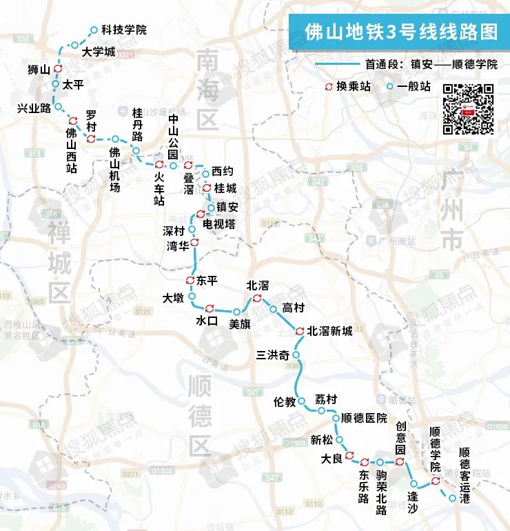 3号线建成后,市民从顺德学院站/科技学院站出发,一小时即可到达广州机场、半小时进入佛山中心城区、一小时通达广佛核心区。