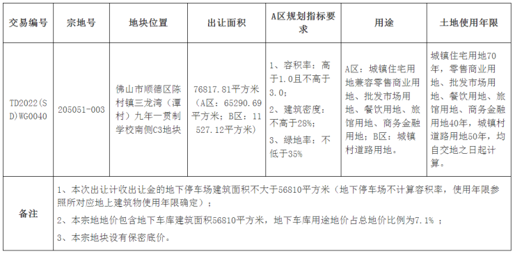 地块位于佛山市顺德区陈村镇三龙湾(潭村)九年一贯制学校南侧C3地块,出让面积为76817.81平方米(A区:65290.69平方米;B区:11527.12平方米)。