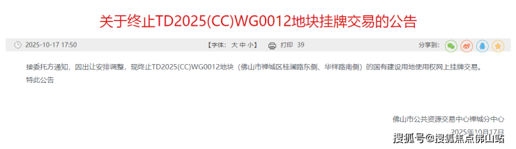 公告显示,接委托方通知,因出让安排调整,现终止TD2025(CC)WG0012地块(佛山市禅城区桂澜路东侧、华祥路南侧)的国有建设用地使用权网上挂牌交易。