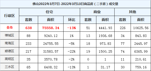 二手房方面,上周网签量仅有638套,环比下跌13%。其中,顺德区跌幅较大,达到22%,网签量为217套。