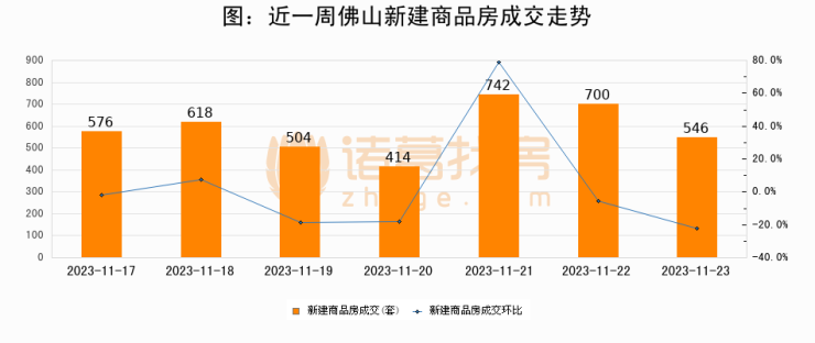 根据佛山市住房保障和房产信息网数据显示,2023年11月23日佛山新建商品房成交546套,较昨日减少154套,环比下降22%