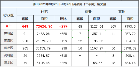 二手方面,网签共录得649套,成交面积约7.36万㎡,环比下跌27%,其中顺德成交265套,南海网签218套,禅城成交91套,三水成交49套,高明成交26套。