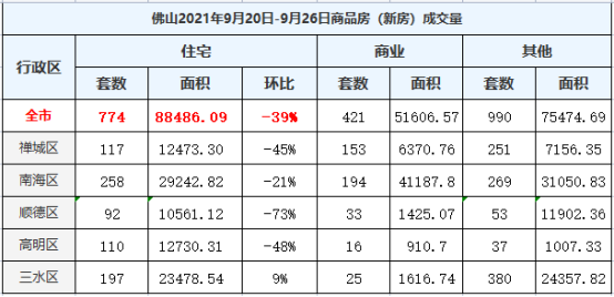 据搜狐焦点佛山站统计,上周(9月20日-9月26日)佛山新房成交774套,成交面积约8.85万㎡,环跌39%,其中顺德、高明两区成交量跌速较快,分别网签92套、110套,禅城成交117套,南海成交258套, 三水成交197套。