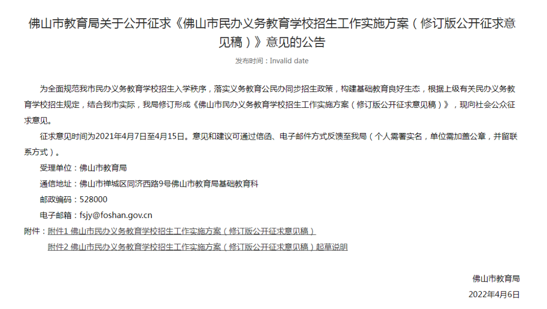 与此同时,昨日,佛山市教育局还发布了关于公开征求《佛山市民办义务教育学校招生工作实施方案(修订版公开征求意见稿)》意见的公告,征求意见时间为2022年4月7日至4月15日。