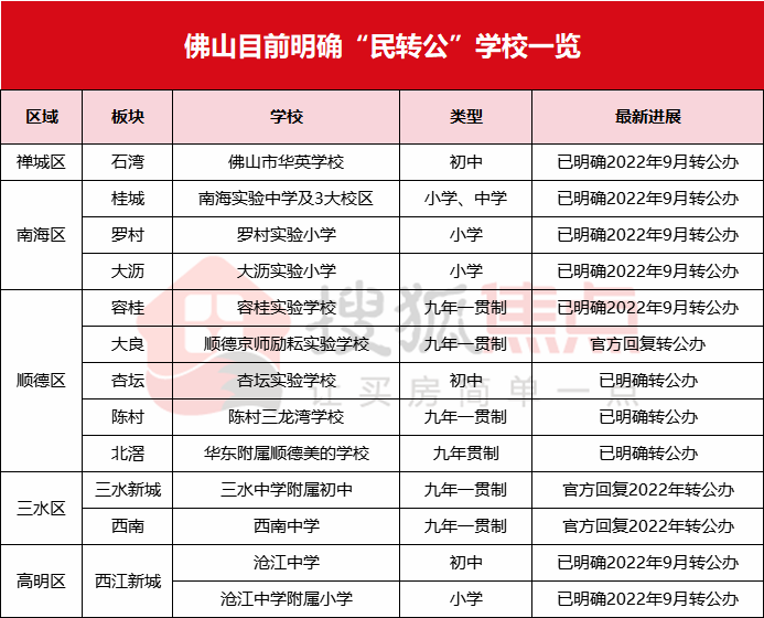 据小编不完全统计,截至目前,佛山已有至少13所民办学校明确转为公办。其中,有7所学校已明确转公时间,均为2022年9月起。