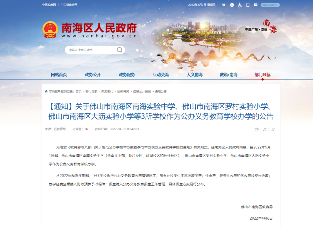为落实《教育部等八部门关于规范公办学校举办或者参与举办民办义务教育学校的通知》有关规定,经南海区人民政府同意,自2022年9月1日起,佛山市南海区南海实验中学(含南实本部、映月校区、灯湖校区和桂外校区)、佛山市南海区罗村实验小学、佛山市南海区大沥实验小学作为公办义务教育学校办学。