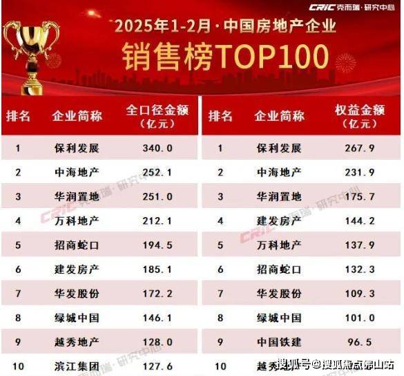 3月3日,据克而瑞地产研究中心发布的报告数据,今年前两个月保利发展以全口径销售额340亿元位居第一,紧随其后的两名分别为中海地产和华润置地,销售额分别为252.1亿元和251亿元。