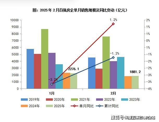 2025年2月,中国房地产市场延续止跌回稳态势,叠加春节假期因素影响,整体保持低位运行。2月,TOP100房企实现销售操盘金额1881.2亿元,同比增长1.2%,单月业绩规模保持在历史较低水平。