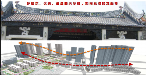 (1)龙脊天际线布局,“南北高,中间低”,南北近500米超宽楼距。