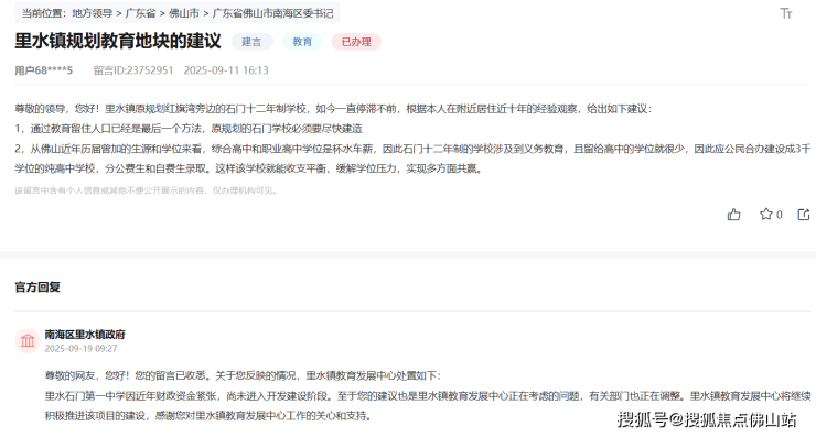 近日,有网友在领导留言板上咨询关于里水镇规划教育地块的建议。