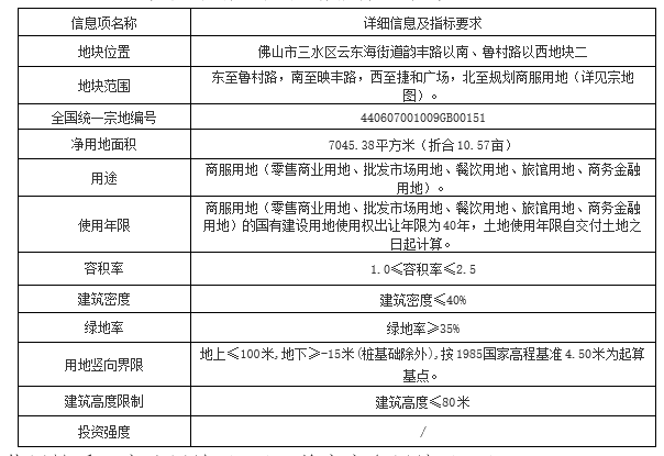 根据公告内容,宗地位于云东海街道韵丰路以南、鲁村路以西地块二,总占地面积7045.38㎡,容积率≥1且≤2.5,建筑密度≤40%,绿地率≥35%,建筑高度不高于80米,土地用途为商服用地,须1年内动工,3年内竣工。