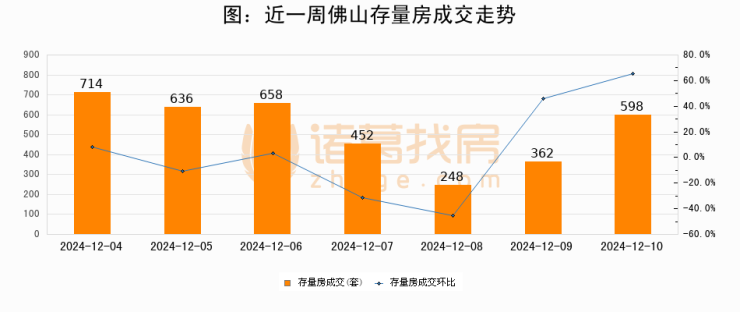 从存量房来看,2024年12月10日佛山存量房单日成交598套,比昨日增加236套,环比上涨65.2%。从近一周存量房成交来看,佛山存量房日均成交套数为524套,12月10日单日成交598套,高于近一周平均水平14.1%。