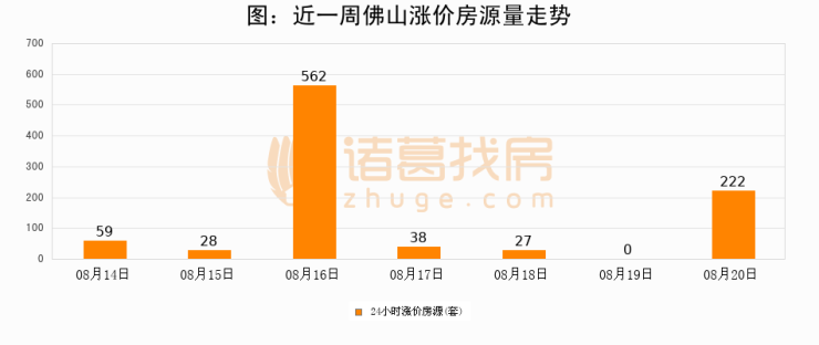 根据诸葛找房数据显示,佛山24小时涨价房源量为222套,较08月19日增加222套,环比上涨0%。与此同时,涨价房源占比小幅扩大,业主信心有所提升。