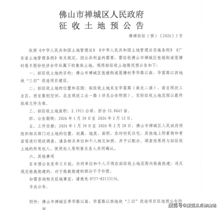 近日,佛山市自然资源局禅城分局发布佛禅府征(预)〔2026〕3号土地征收预公告。