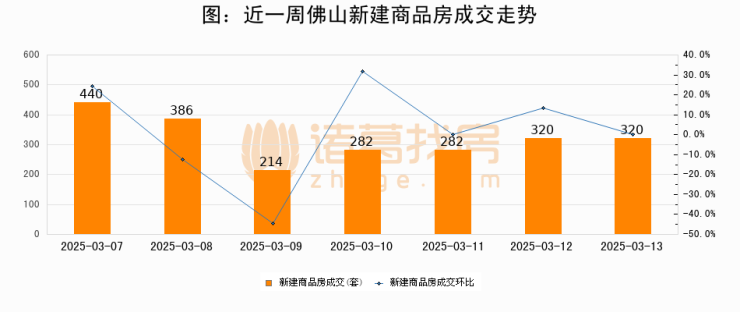 根据佛山市住房保障和房产信息网数据显示,2025年03月13日佛山新建商品房成交320套,较昨日持平