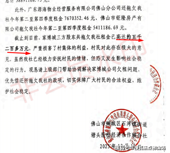 比如塘头村股份经济合作联合社,自2017年起,家博城股东B栋左某长期拖欠物业集体租金,截至2022年共计超3889万元,广东源海物业经营服务有限公司佛山分公司及佛山市钜隆房产拖欠租金超1200万。