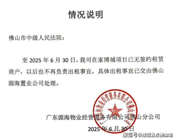 值得注意的是,附件提供了一份源海物业情况说明,表明其在家博城项目已无签约租赁商户,以后不再负责出租事宜,具体出租事宜已交由佛山源海置业公司处理。