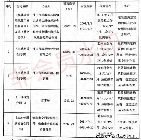 从评估报告来看,整个项目出租方有5家,其中出租面积最大的是塘头股份经济合作社、沙岗村东凤股份经济合作社,租赁面积129726.53㎡,租赁期限2008-2048年。