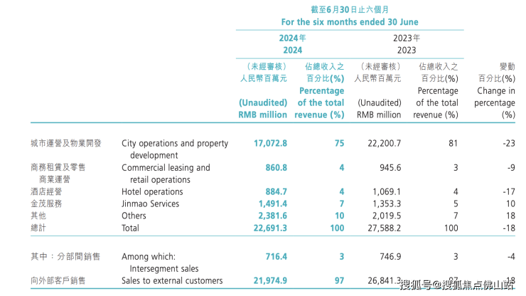 财报数据显示,2024年上半年中国金茂收入约219.74亿元,同比下降18%。对于下降的原因,中国金茂在财报中解释称主要系城市运营及物业开发、商务租赁及零售商业运营、酒店经营收入较2023年上半年同期减少。