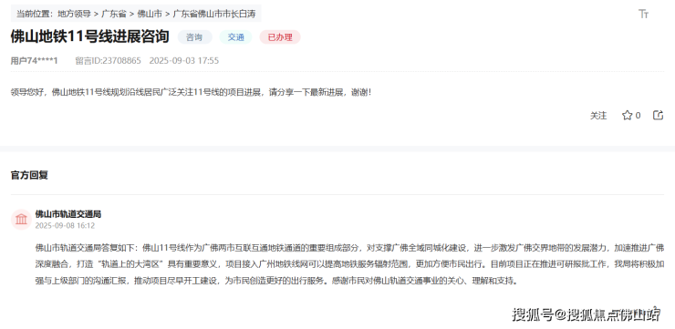 近日,有网友在领导留言板咨询佛山地铁11号线进展。