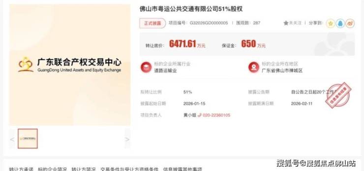 该交易为粤运公司51%股权以6471.61万元的价格挂牌转让,该公司是禅城区最大的公交企业,其运营线路主要覆盖禅城。
