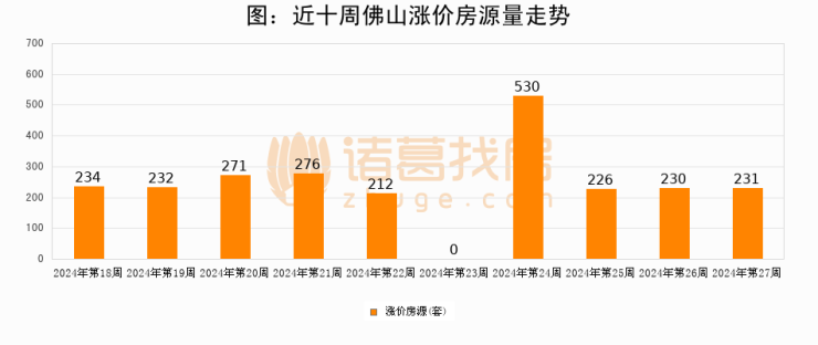 从调价房源来看,第27周佛山涨价房源231套,较上周上涨0.4%。与此同时,27周涨价房源占比提升1.54个百分点,业主信心持续恢复。