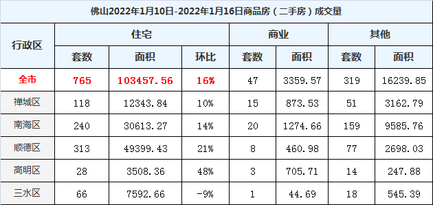 二手方面,上周成交765套,成交面积超10万㎡,环比上涨16%,其中顺德网签314套,南海网签240套,禅城网签118套,三水网签66套,高明网签28套。