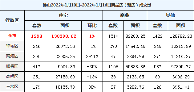 据搜狐焦点佛山站统计佛山房产信息网数据,上周佛山新房网签1298套,成交面积138398.62㎡,环比上周上涨1%,其中顺德则以625套位居排名前列,而南海区在新系统上线后,网签数量大幅回暖205套,高明、禅城两区网签数量相当,分别有251、246套,三水则以179套网签量垫底。