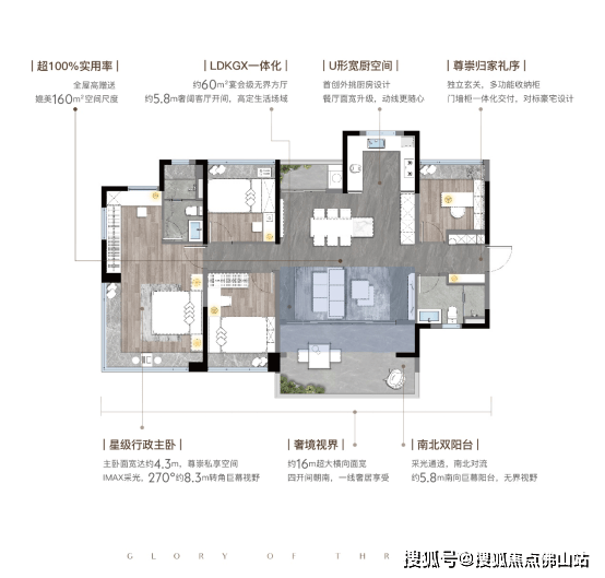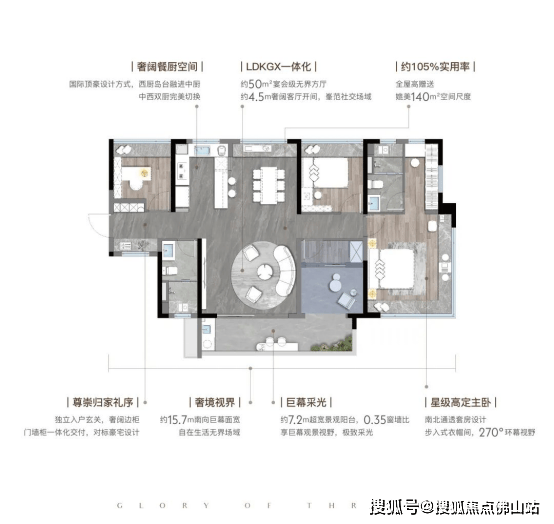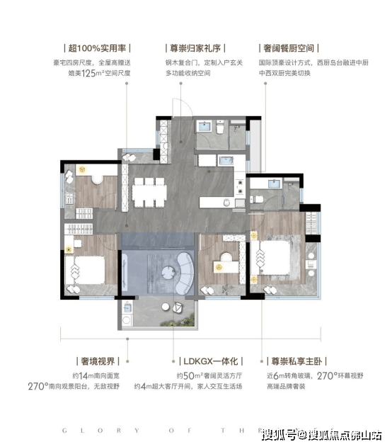 近14米南向大面宽,LDKGX一体化设计,约50㎡奢阔方厅,同享高端社区价值。